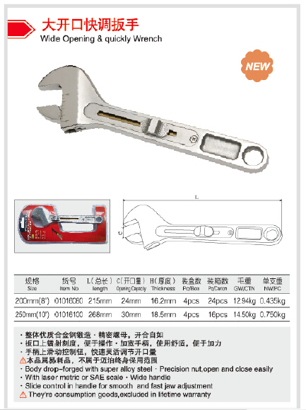 整体优质合钢金锻造,精密螺母,开合自如.扳口上镭射刻度,便于操作,加宽手柄,使用舒适,便于加力,手柄上滑动控制钮,快速灵活调节开口量.本产品属易耗品,不在迈泊终身保用范围.