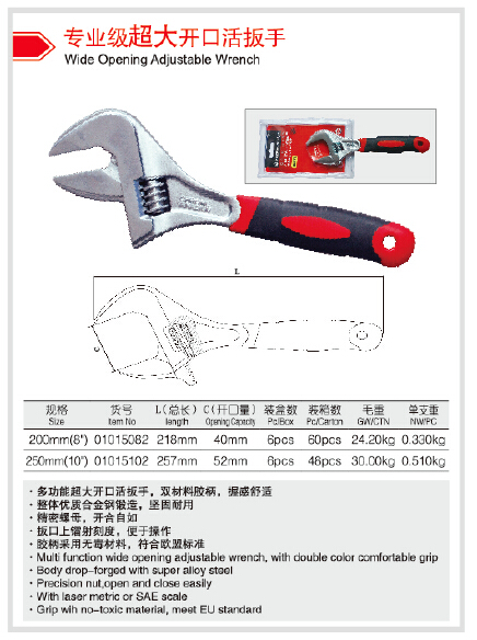 多功能超大开口活扳手,双材料胶柄,握感舒适,整体优质合金钢锻造,坚固耐用,精密螺母,开合自如,扳口上镭射刻度,便于操作,胶柄采用无毒材料,符合欧盟标准.