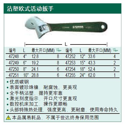 优质碳钢,表面镀珍珠镍,耐腐蚀,更美观,全手柄沾塑,握持更牢靠,激光刻度指示,开口尺寸更直观.数控机床加工,操作更顺畅.头部特殊加热处理,强度更高,更耐磨,使用寿命持久.*本品属易耗品,不属于世达终身保用范围.