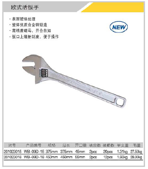 表面镀铬处理,整体优质合金钢锻造,高精度螺母,开合自如,扳口上镭射刻度,便于操作.
