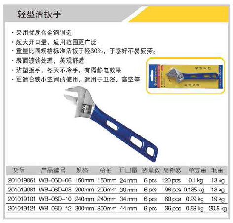 采用优质合金钢锻造,超大开口量,适用范围更广泛,重量比同规格标准活扳手轻30%,手感好不易疲劳.表面镀铬处理,美观舒适.沾塑扳手,冬天不冷手,有隔静电效果,更适合狭小空间的使用,适用于卫浴、高空等.