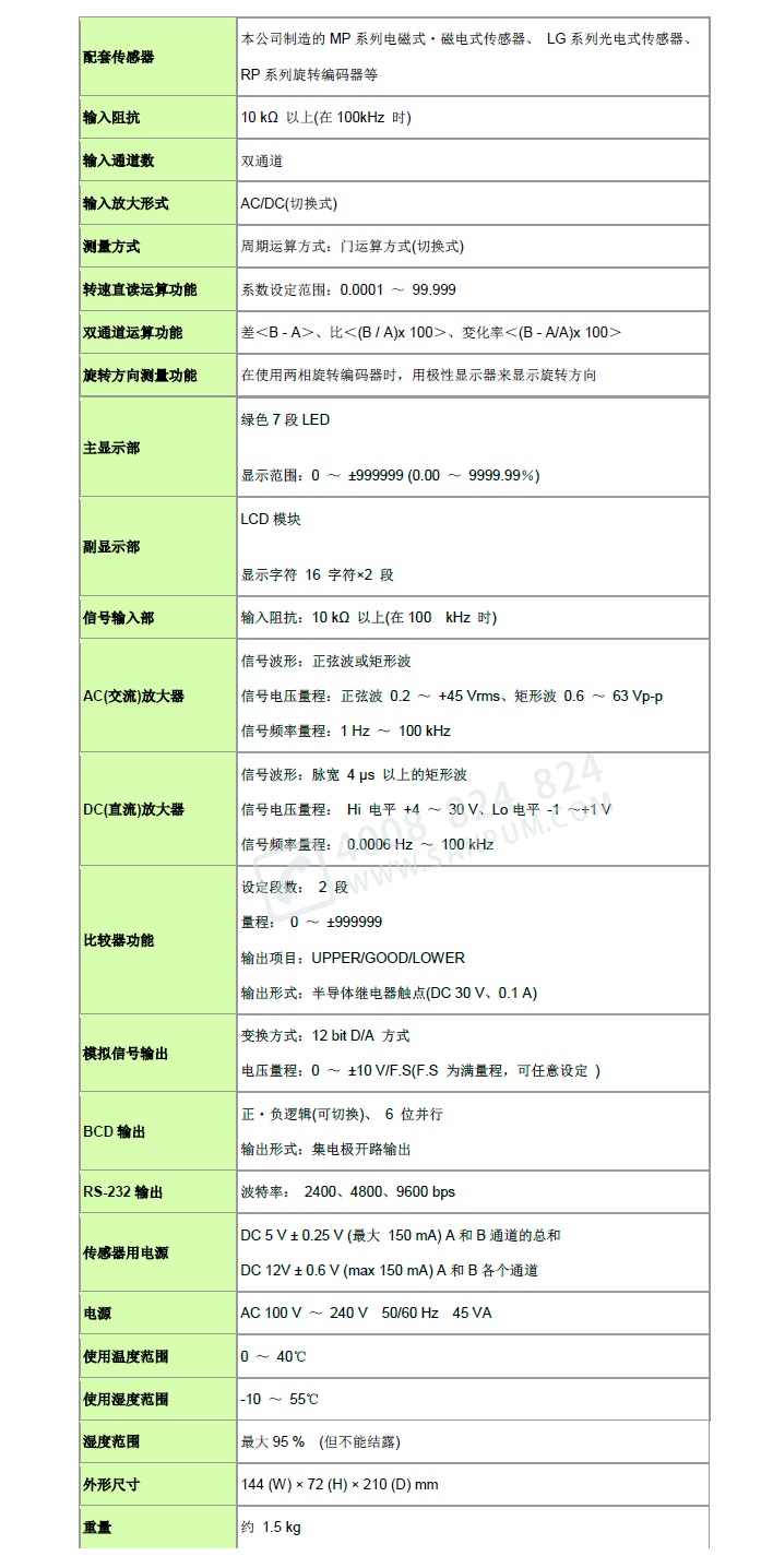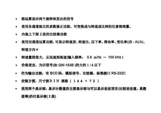 能运算显示两个旋转体发出的信号;使用各通道独立的系数修正功能,可变换成与转速成比例的任意物理量;内装上下限2段的比较器功能;使用双通道运算功能,可显示转速差、转速比、压下率、滑动率、变化率((B - A)/A)、 转速方向;转速量程很大,从低速到高速(输入频率:0.6 mHz〜100 kHz).