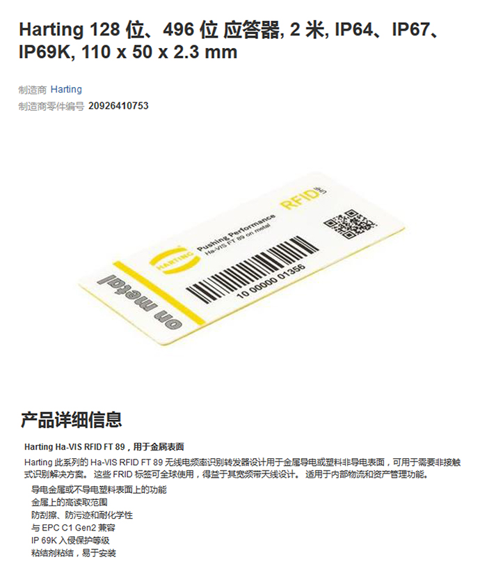 211867/Harting Ha-VIS RFID FT 89/用于金属表面128/496位应答器 Harting Ha-VIS RFID FT 89
