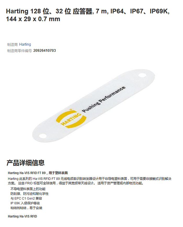 211868/Harting Ha-VIS RFID FT 89/用于塑料表面128/32位应答器 Harting Ha-VIS RFID FT 89