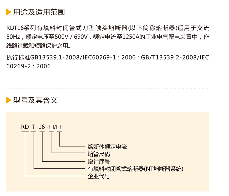 适用于交流50Hz,额定电压至500V/690V,额定电流至1250A的工业电气配电装置中,作线路过载和短路保护之用