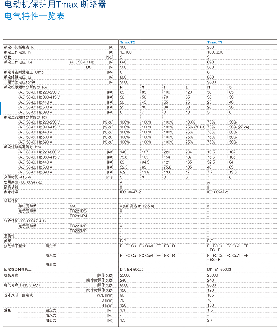 214173/T2H160PR221DSR10-FFC-3P/Tmax电动机保护用塑壳断路器