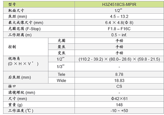 H3Z4518CS-MPIR 百万像素系列变焦镜头