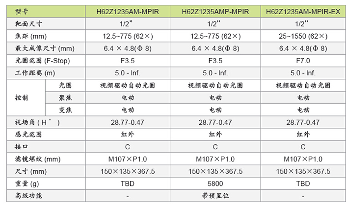 H62Z1235AM-MPIR-EX 百万像素电动变倍镜头