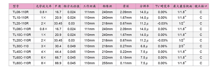 214732/TL20C-110R/WD110内置型远心镜头系列
