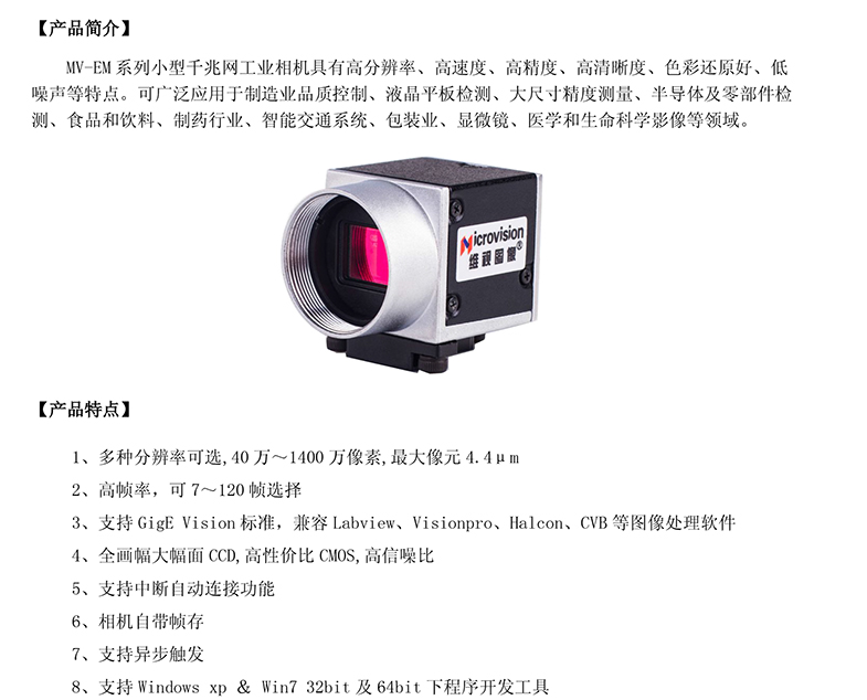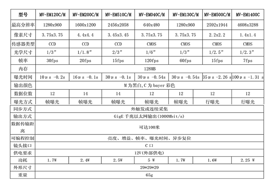 215801/MV-EM120M/MV-EM系列小型GigE千兆网带帧寸工业相机