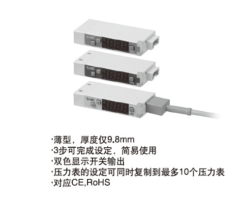 薄型,厚度仅9.8mm;3步就可帮助您完成设定,简易使用;双色显示开关输出;对应CE.RoHS.