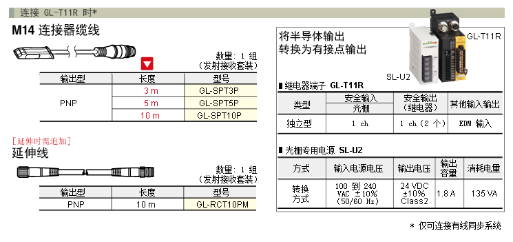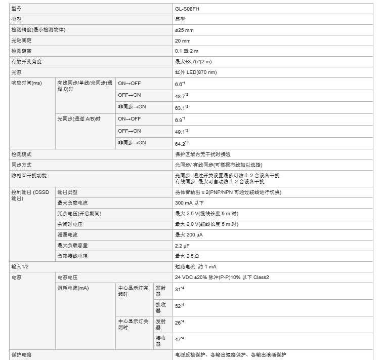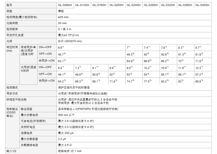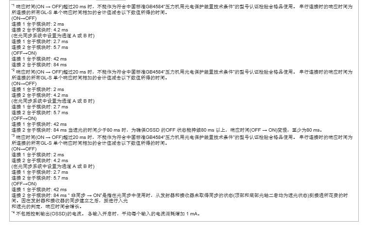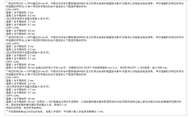 *3 响应时间(ON → OFF)超过20 ms 时,不能作为符合中国标准GB4584“压力机用光电保护装置技术条件”的型号认证检验合格品使用。 串行连接时的响应时间为所连接的所有GL-S 单个响应时间相加的合计值减去以下数值所得的时间。 |