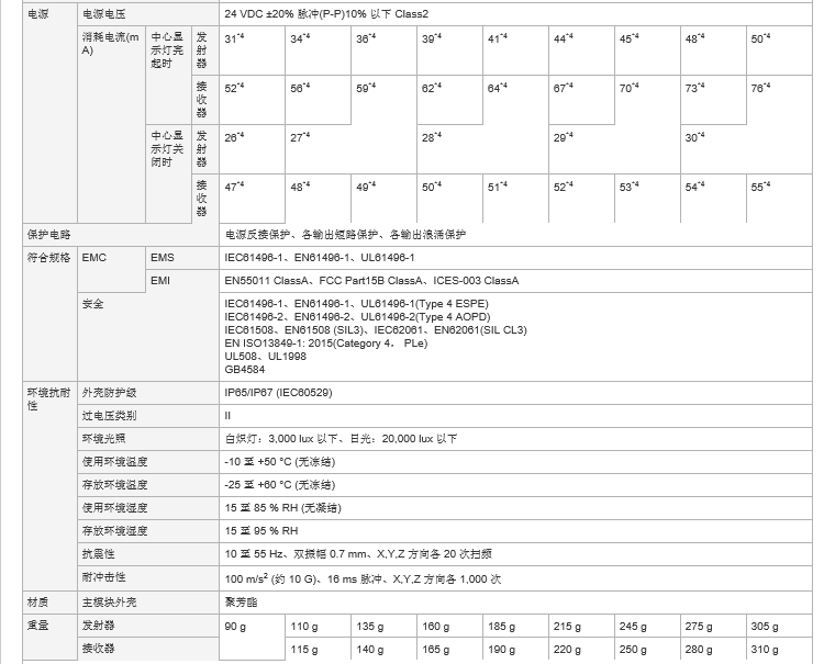 *4 不包括控制输出(OSSD)的电流。 各输入开启时,平均每个输入的电流消耗增加 1 mA。 |