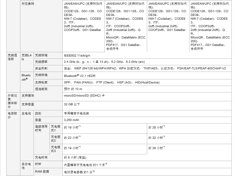 *1 操作确认LED、关闭振动功能、开启蜂鸣器 (音量小)、开启背光灯 (低亮度)、常温下20 秒读取1 次条形码、进行往返无线通信时的连续使用时间。 |