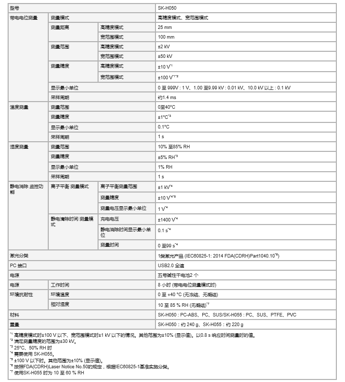 *1 在 8 至 12 mm 的测量距离和对一个 ±100 V 或以下的静电荷测量得到。当电荷为 ±100 V 至 ±5 kV 时,测量精度是测量值的 ±10%。 |