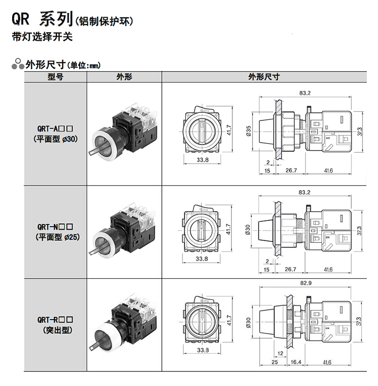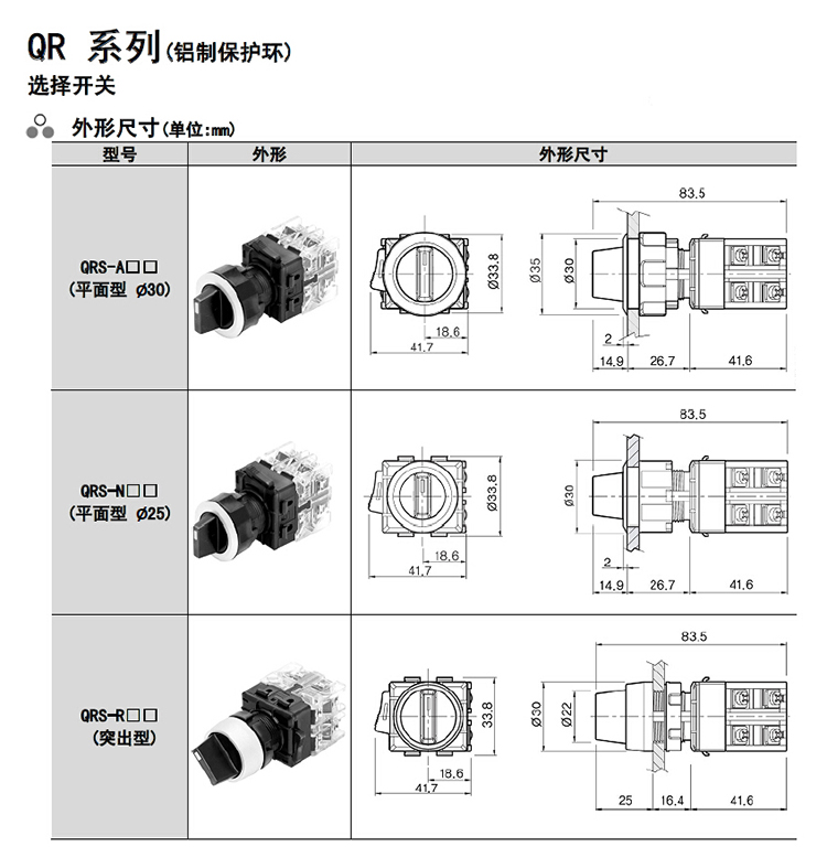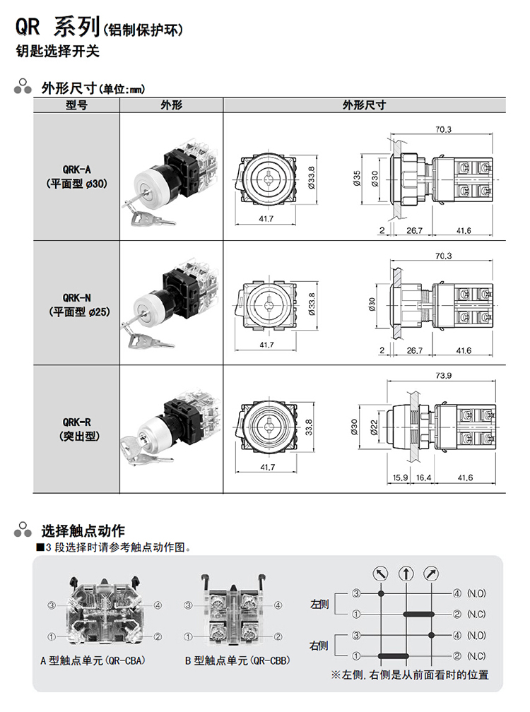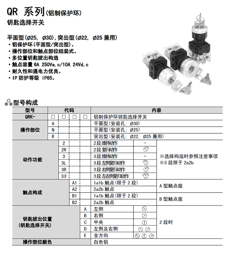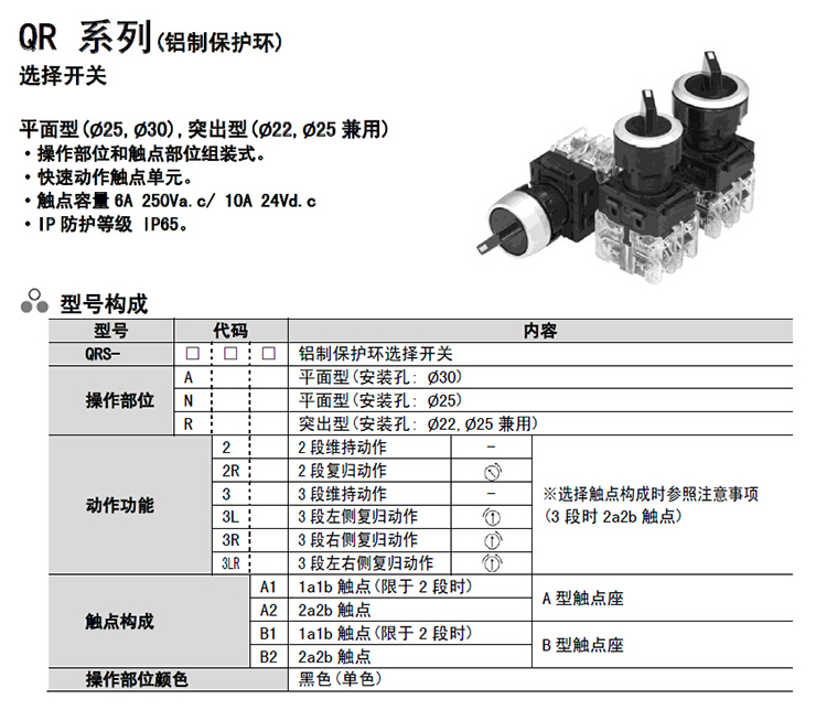 操作部位和触点部位组装式; 快速动作触点单元; 触点容量6A 250Va.c/ 10A 24Vd.c IP 防护等级 IP65。