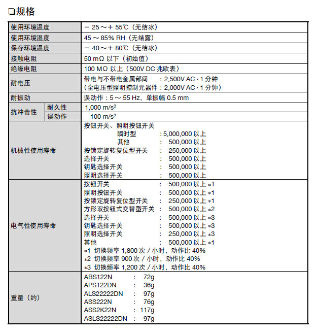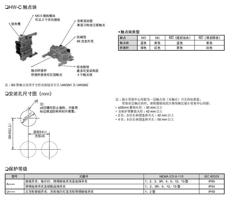 性能可靠性高; 使用具备高信赖性的HW-C触点块; 保护等级:IP65(IEC 60529); 经UL、CSA及CCC认证,符合EN标准; 工业用的高耐受力控制元器件。