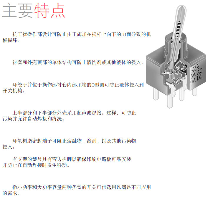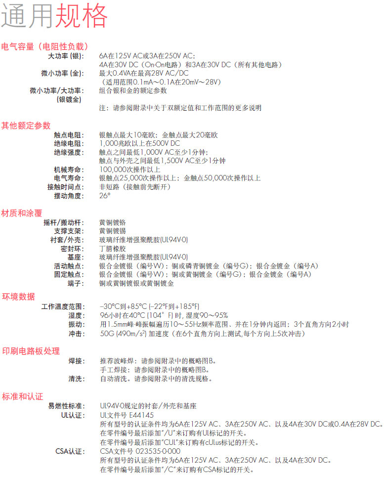 密封处理; 6A大功率和0.4VA微小功率; 直型、直角、垂直、以及扩展PC端子; 印刷电路板安装。