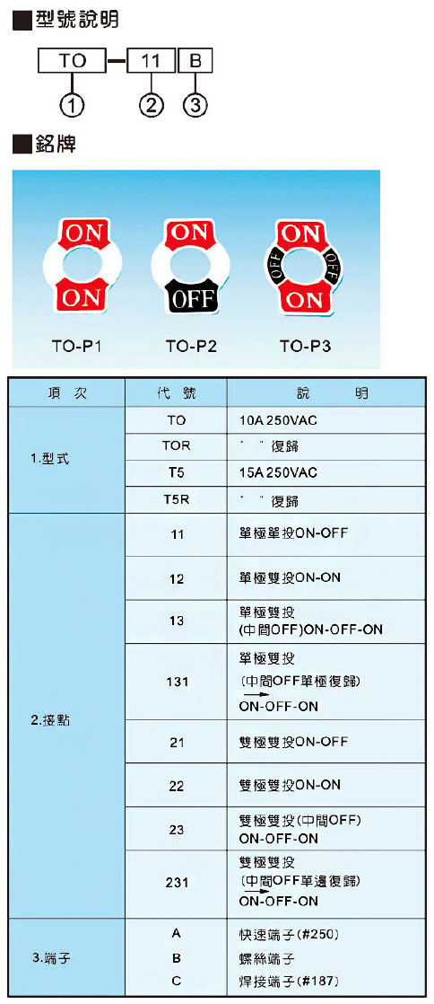 10A及15A电流; 有固定式及复归式两种切换方式; 螺丝端子以及焊接端子两种接线端子; 防水套可防水防油,适用于全系列; 固定孔径:Φ12mm。