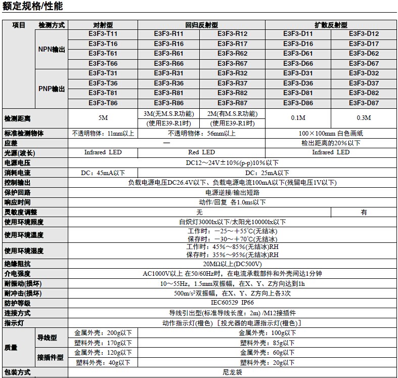 E3S-AR11 水平型 回归反射2M E3S-AR61 垂直型 回归反射2M E3S-BT61 垂直型 对射式2M E3R-DS30E4 扩散反射 30CM E3R-5E4 对射式 5M