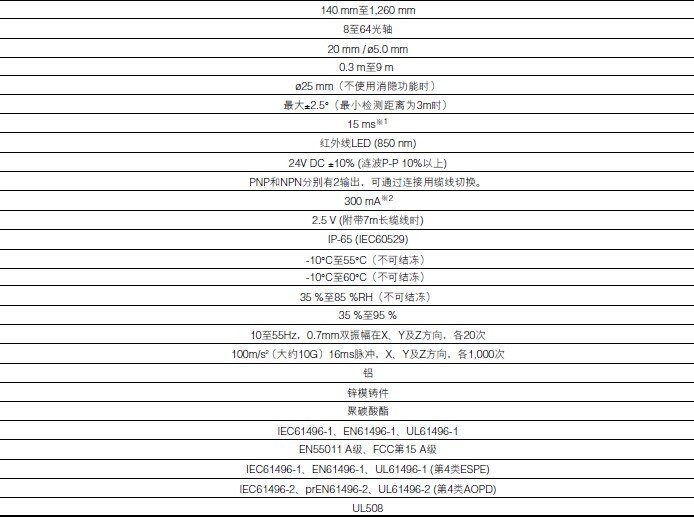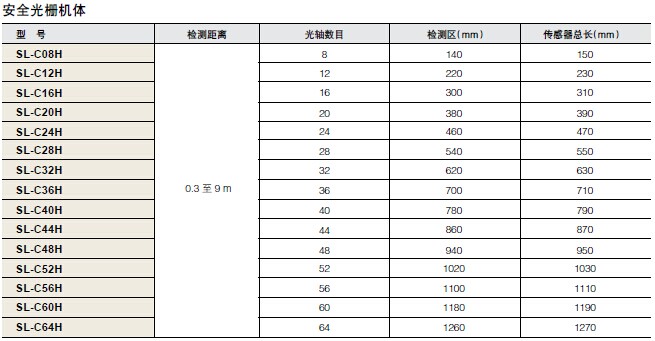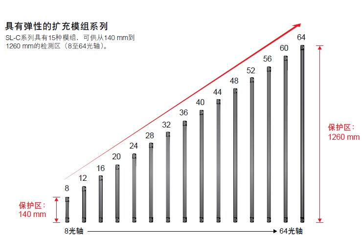 具有15种模组,可供从140mm到1260mm的检测区(8至64光轴);