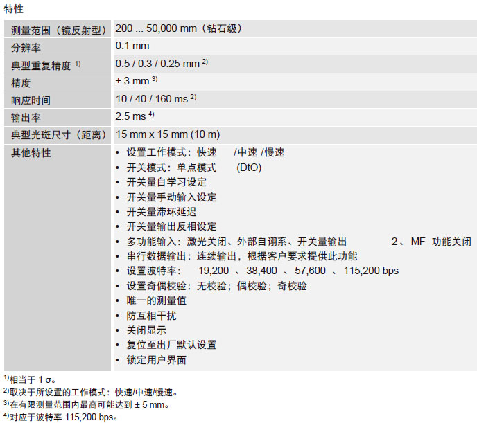基于“飞行时间”测量原理,测量快速、准确(漫反射量程远达10米); 直观的显示面板,调试方便、快捷; 红色恒温激光光点,定位精确; -30°C至±65°C宽温工作范围; 带RS422和数字量输出;