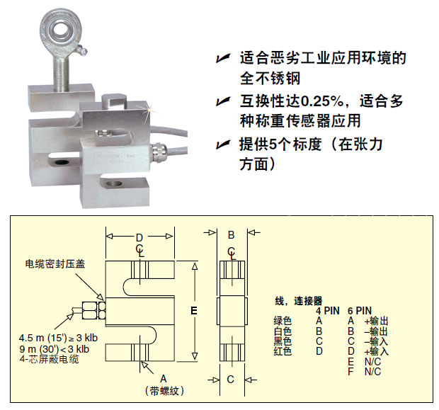 适合恶劣工业应用环境的全不锈钢; 互换性达0.25%,适合多种称重传感器应用; 提供5个标度(在张力方面)