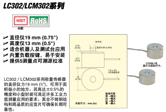 LCM302系列直径仅19mm的不锈钢压缩称重传感器(标准及公制型号)