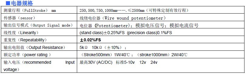精密电阻信号输出; 适用于测量范围0-2500mm;