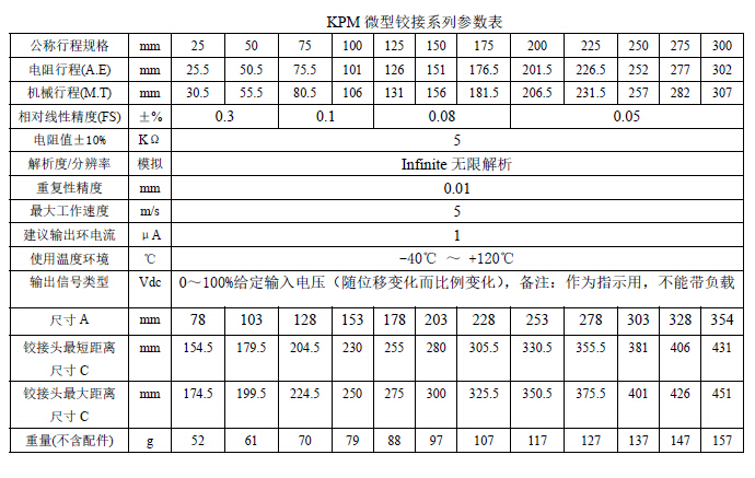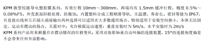 体积小巧; 寿命高达1亿次运动; 分辨率高于0.01mm; 高运行速度; 可在各种恶劣环境下使用(潮湿、油污、灰尘); 防护等级IP67; 球眼接头,可大角度(±12.5°)自由运动;
