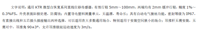 体积小巧; 使用寿命高达5千万次运动; 传感器带复位弹簧; 可在各种恶劣环境下使用(潮湿、油污、灰尘); 防护等级IP67; DIN标准触点; 双轴承连运杆; 不受冲击和震动影响; 电缆方式连接;