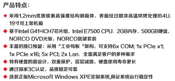 釆用1.2mm优质碳索高强度结构钢箱体,表面经过喷涂高温烘烤处理的4U, 19寸可上架机箱;基于IntelG41+ICH7芯片组,Intel E7500 CPU, 2GB内存,500GB硬盘, NORCO DVD光驱,NORCO鼠键套装;丰富的接口预留:采用“工业母板”架构,可支持6xCOM;1xPCIex1;1x PCIe x16; 5x PCI;2xLan,全面满足客户的多种需求;特有硬盘防震设计,双重保护,居居减震,硬盘使用寿命更长;通过国家3C认证,品质稳定可靠;选装正版Microsoft Windows XPE定制系统,保证系统运行稳定性