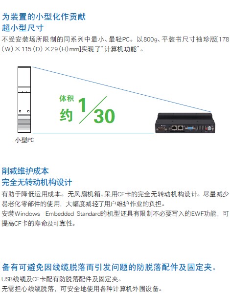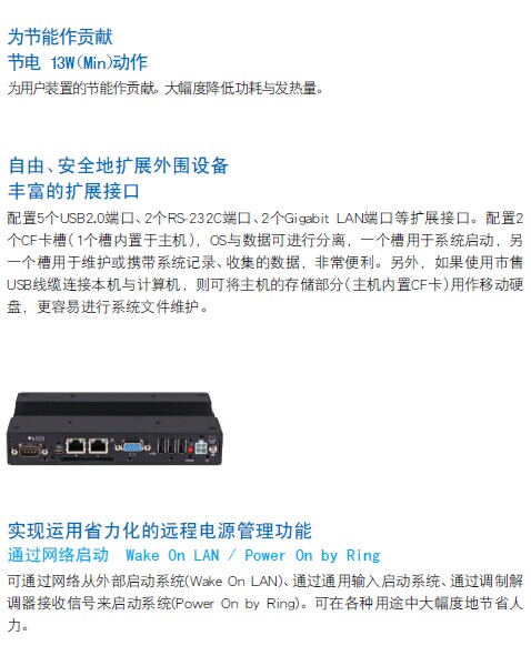 无风扇、节电CPU;轻量、平装书尺寸袖珍版(800g、宽178mmX进深115mmX 高29mm);丰富的扩展接口(USB2.0X5/ RS-232CX2/ GbEX2/ CF插槽X2)。