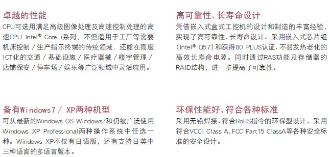 卓越的性能;高可靠性、长寿命设计;提高系统运行效率的丰富的RAS功能;备有Windows7/XP两种机型;环保性能好、符合各种标准.