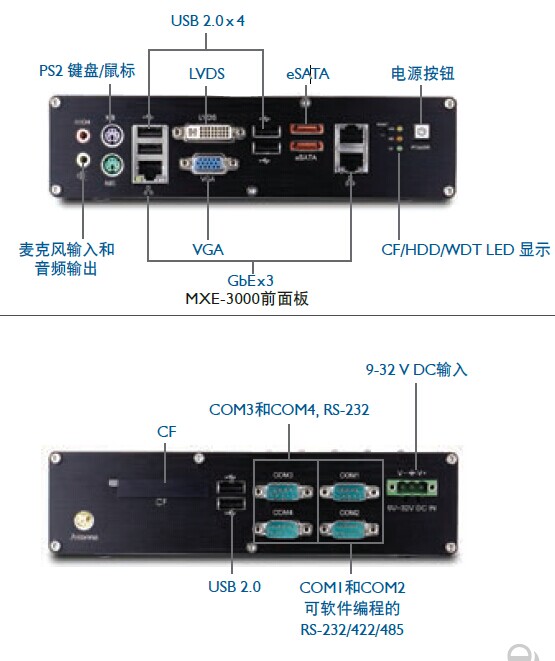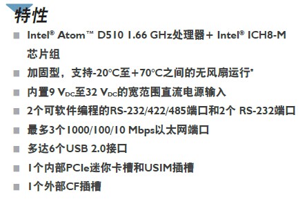 Intel® Atom™ D5I0I.66GHz处理器+lntel® ICH8-M芯片组;加固型,支持-20°C至+70°C之间的无风扇运行*;内置9VDC至32VDC的宽范围直流电源输入;2个可软件编程的RS-282/422/485端口和2个RS-232端口;最多3个1000/100/10Mbps以太网端口;多达6个USB2.0接口;1个内部PCIe迷你卡槽和USIM插槽;1个外部CF插槽.