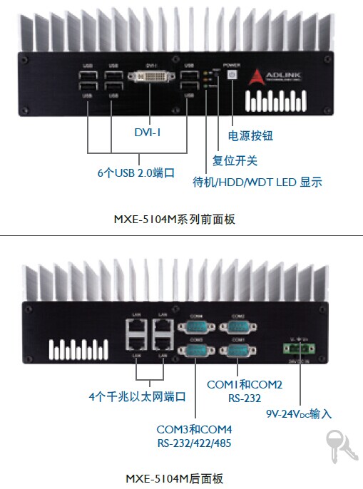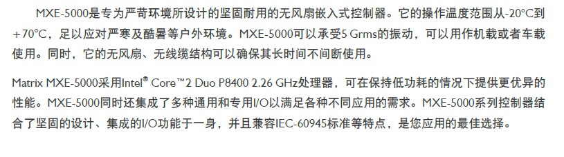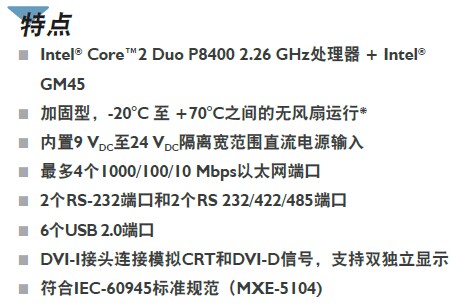 Intel® Core™2 Duo P8400 2.26 GHz 处理器 + Intel® GM45;加固型,-20°C至+70°C之间的无风扇运行*;内置9VDC至24VDC隔离宽范围直流电源输入;最多4个1000/100/10 Mbps以太网端口;2个RS-232端口和2个RS 232/422/485端口;6个USB 2.0端口;DVI-I接头连接模拟CRT和DVI-D信号,支持双独立显示;符合 IEC-60945标准规范(MXE-5104)。