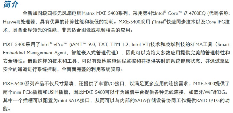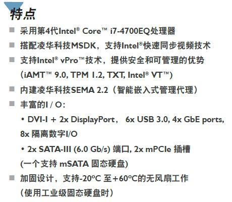 采用第4代Intel® Core™ i7-4700EQ处理器;搭配凌华科技MSDK,支持Intel®快速同步视频技术;支持Intel® vPro™技术、提供安全和可管理的优势 (iAMT™ 9.0, TPM 1.2, TXT, Intel® VT™);内建凌华科技SEMA 2.2 (智能嵌入式管理代理);丰富的I/O:• DVI-I + 2x DisplayPort, 6x USB 3.0, 4x GbE ports, 8x隔离数字I/O •2xSATA-lll(6.0Gb/s)端ロ,2x mPCIe 插槽 (一个支持mSATA固态硬盘);加固设计,支持-20°C至+60°C的无风扇工作 (使用工业级固态硬盘时).