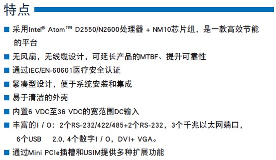 采用Intel® Atom™ D2550/N2600处理器+ NM10芯片组,是ー款高效节能 的平台;无风扇,无线缆设计,可延长产品的MTBF、提升可靠性;通过IEC/EN-60601医疗安全认证;紧凑型设计,便于系统安装和集成;易于清洁的外売;内置6 VDC至36 VDC的宽范围DC输入;丰富的I/O: 2个RS-232/422/485+2个RS-232, 3个千兆以太网端口,6个USB 2.0, 4个数字I/O,DVI+ VGA;通过Mini PCIe插槽和USIM提供多种扩展功能.