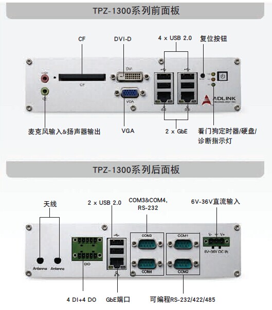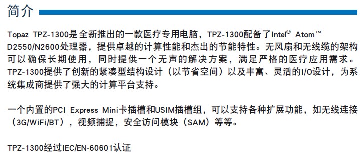 TPZ-1300系列 医疗专用电脑,支持Intel® Atom™ D2550/N2600处理器,提供丰富的接口