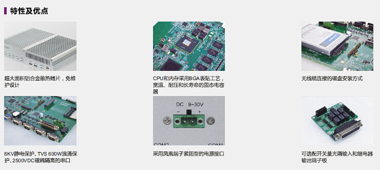 超大面积铝合金散热鳍片,免维护设计;CPU和内存采用BGA表贴工艺,宽温、耐压和长寿命的固态电容器;无线缆连接的磁盘安装方式;8KV静电保护、TVS 600W浪涌保护、2500VDC磁耦隔离的串口;采用凤凰端子紧固型的电源接口;可选配开关量光隔输入和继电器输出端子板.