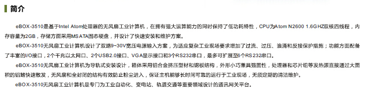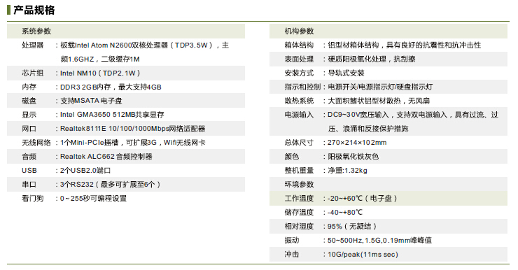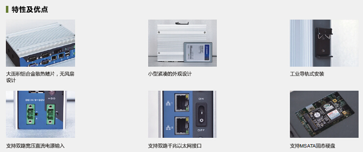 大面积铝合金散热鳍片,无风扇设计;小型紧凑的外观设计;工业导轨式安装;支持双路宽压直流电源输入;支持双路千兆以太网接口;支持MSATA固态硬盘.