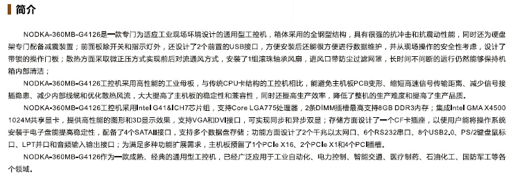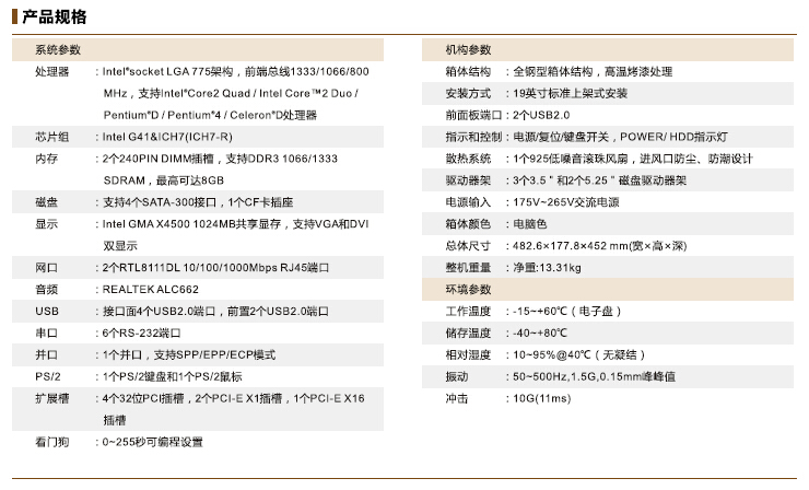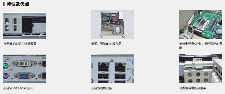 方便维护的防尘过滤装置;美观、整洁的内部布局;支持电子盘CF卡,搭建稳定的系统;支持VGA和DVI双显示;支持双网络功能;带弹簧减震的硬盘架.