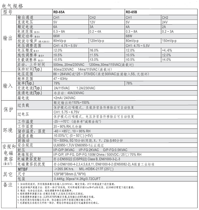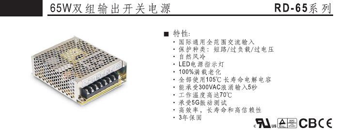国际通用全范围交流输入;保护种类:短路/过负载/过电压;自然风冷;LED电源指示灯;100%满载老化;全部使用105°C长寿命电解电容 ;能承受300VAC浪涌输入5秒;工作温度高达70°C;承受5G振动测试;高效率,长寿命和高信赖性;3年保固.