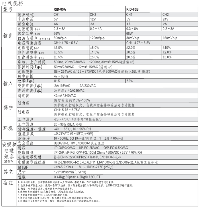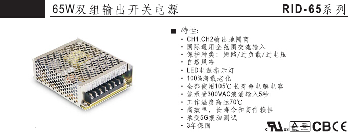 CH1,CH2输出地隔离;国际通用全范围交流输入;保护种类:短路/过负载/过电压;自然风冷;LED电源指示灯;100%满载老化;全部使用105°C长寿命电解电容;能承受300VAC浪涌输入5秒;工作温度高达70°C;高效率,长寿命和高信赖性;承受5G振动测试;3年保修.