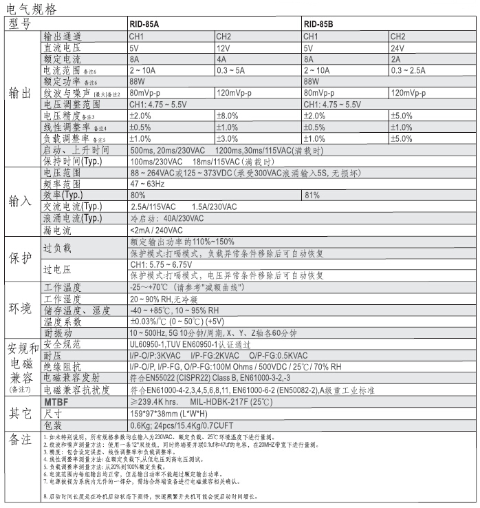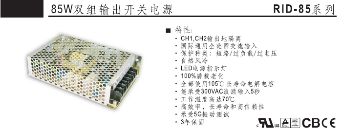 CH1,CH2输出地隔离;国际通用全范围交流输入;保护种类:短路/过负载/过电压 ;自然风冷;LED电源指示灯;100%满载老化;全部使用105°C长寿命电解电容;能承受300VAC浪涌输入5秒;工作温度高达70°C;高效率,长寿命和高信赖性;承受5G振动测试;3年保固.