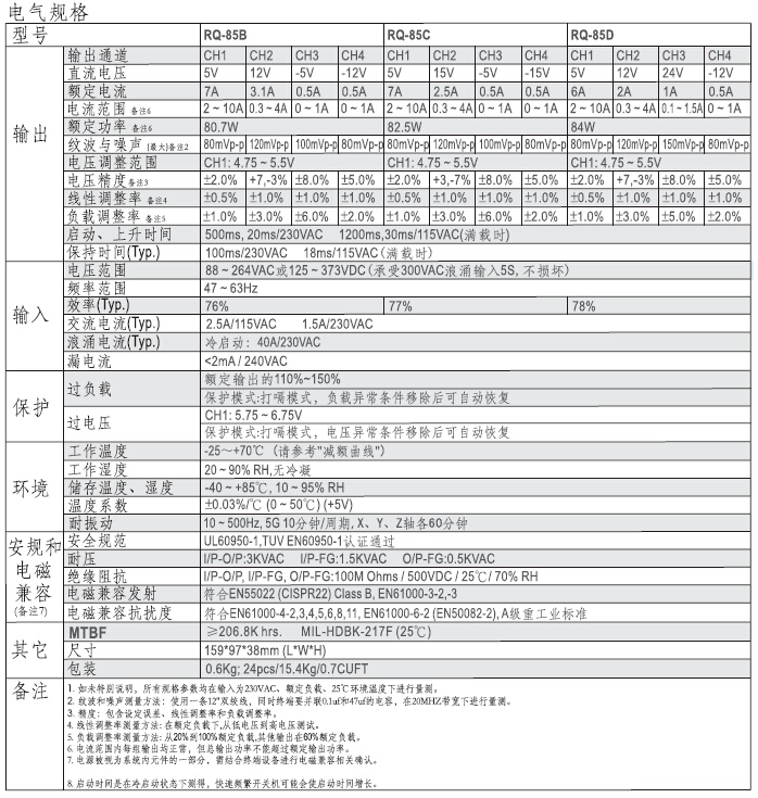 国际通用全范围交流输入;保护种类:短路/过负载/过电压;自然风冷;LED电源指示灯;100%满载老化;全部使用105°C长寿命电解电容;能承受300VAC浪涌输入5秒;工作温度高达70°C;承受5G振动测试;高效率,长寿命和高信赖性;3年保固.