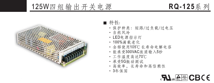 保护种类:短路/过负载/过电压;自然风冷;LED电源指示灯;100%满载老化;全部使用105°C长寿命电解电容;能承受300VAC浪涌输入5秒;工作温度高达70°C;承受5G振动测试;高效率,长寿命和高信赖性;3年保固.