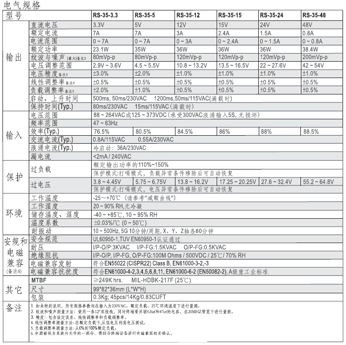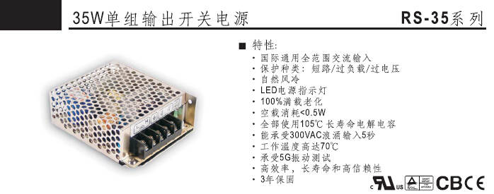 国际通用全范围交流输入;保护种类:短路/过负载/过电压;自然风冷;LED电源指示灯;100%满载老化;空载消耗<0.5W;全部使用105°C长寿命电解电容;能承受300VAC浪涌输入5秒;工作温度高达70°C;承受5G振动测试;高效率,长寿命和高信赖性;3年保固.