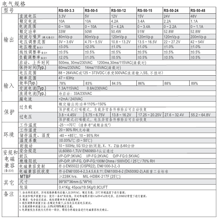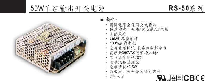 国际通用全范围交流输入;保护种类:短路/过负载/过电压;自然风冷;LED电源指示灯;100%满载老化;全部使用105°C长寿命电解电容;能承受300VAC浪涌输入5秒;工作温度高达70°C;承受5G振动测试;空载消耗<0.5W;高效率,长寿命和高可靠性;3年保固.