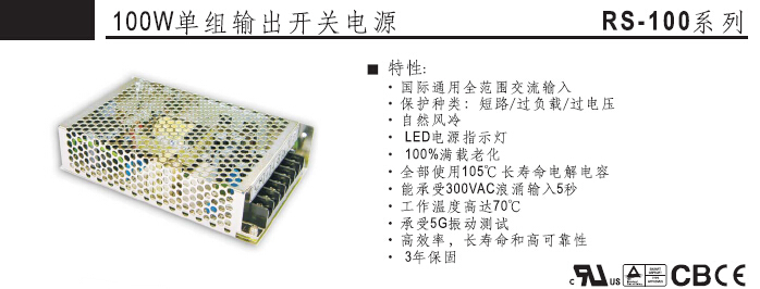 国际通用全范围交流输入;保护种类:短路/过负载/过电压;自然风冷;LED电源指示灯;100%满载老化;全部使用105°C长寿命电解电容;能承受300VAC浪涌输入5秒;工作温度高达70°C;承受5G振动测试;高效率,长寿命和高可靠性;3年保固.
